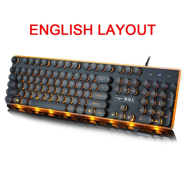Gaming Teclado Russo Retro Rodada Glowing Keycap Metal Painel Retroiluminado USB Wired Painel Iluminado de Metal Fronteira